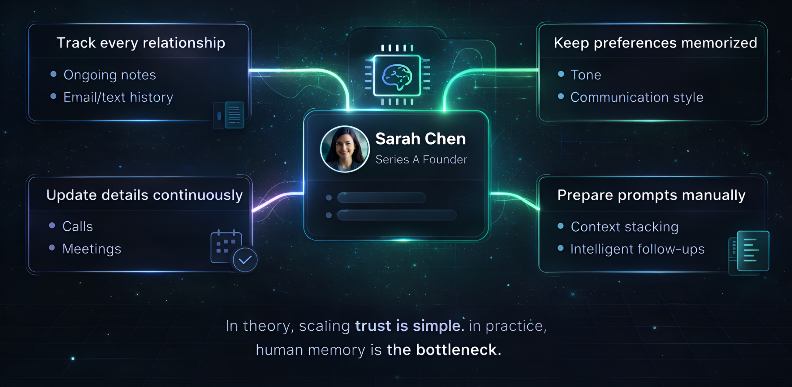 You can’t scale this manually. You can’t keep 500 “Social DNA” profiles in a spreadsheet without losing your mind. The moment you get busy, your system breaks. Your memory leaks. You fall back on “standard” prompts because you’re tired.